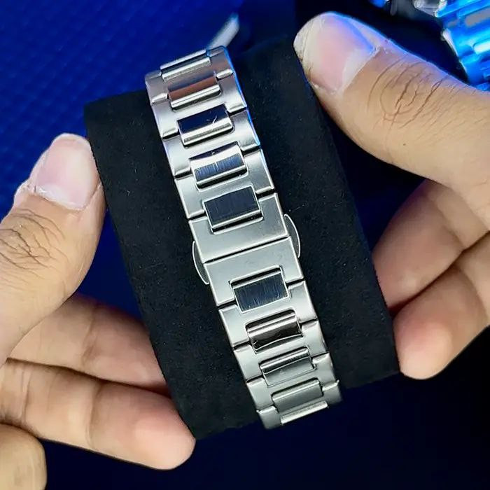 این مدل با قاب و بند استیل نقرهای، در کنار صفحه سرمهای آنالوگ، جلوهای خاص و متمایز به استایل شما میبخشد. نوع قفل پروانهای باعث راحتی در استفاده و امنیت بیشتر روی مچ دست میشود.